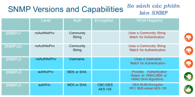 | v3 | authPriv | MD5/SHA | DES/AES | ✅ Tốt nhất – đầy đủ bảo mật |