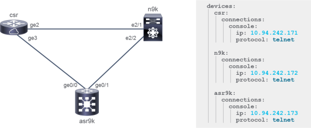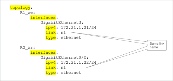 topology: R1_xe: interfaces: GigabitEthernet3: ipv4: 10.0.0.1/24 link: n1 R2_xr: interfaces: GigabitEthernet0/0/0: ipv4: 10.0.0.2/24 link: n1
