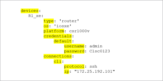 devices: R1_xe: os: iosxe type: router platform: csr1000v connections: cli: protocol: ssh ip: 192.168.1.1