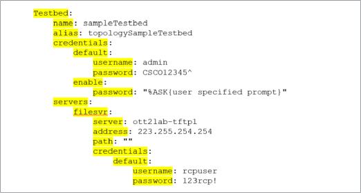 testbed: name: sampleTestbed credentials: default: username: admin password: %ASK{}